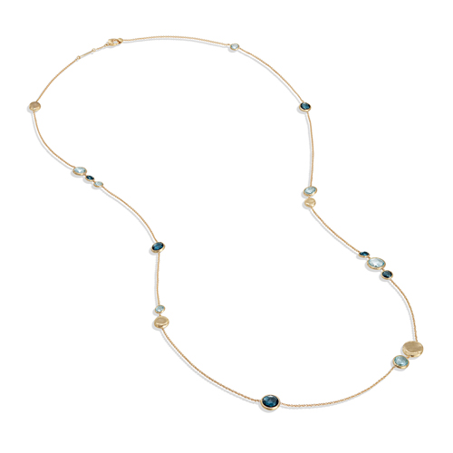 18kt Yellow Gold long Necklace with topazes in various shades of blue